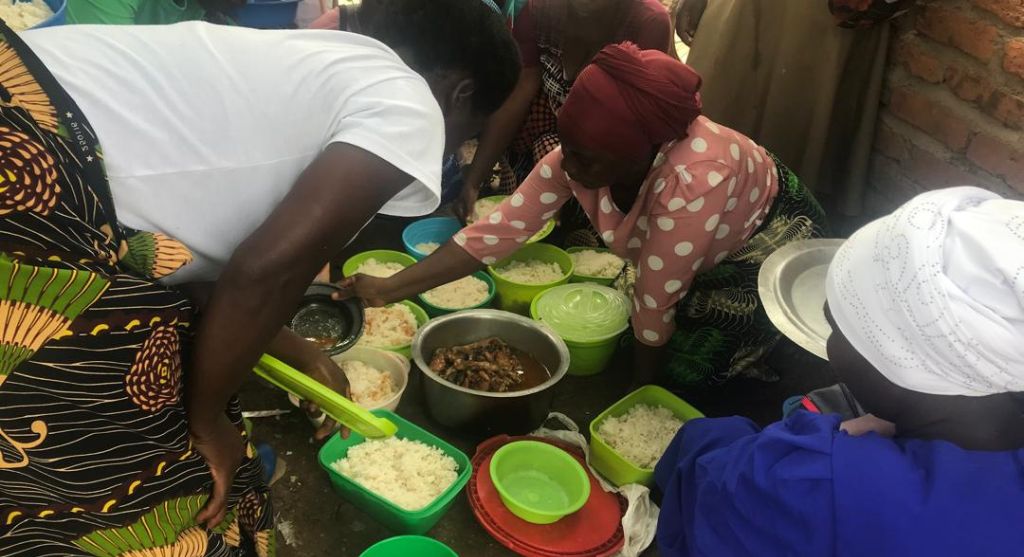 Auf den Bildern sind die großen Kochtöpfe zu sehen, aus denen für alle gekocht wurde – und die langen Schlangen, die zeigen, wie groß der Bedarf, aber auch die Freude über eine gemeinsame Mahlzeit ist.