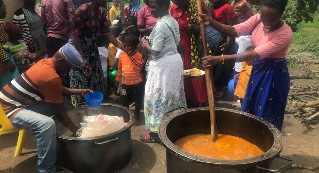 Auf den Bildern sind die großen Kochtöpfe zu sehen, aus denen für alle gekocht wurde – und die langen Schlangen, die zeigen, wie groß der Bedarf, aber auch die Freude über eine gemeinsame Mahlzeit ist.